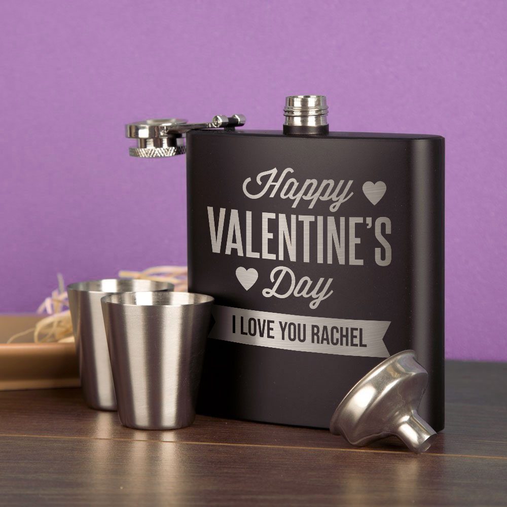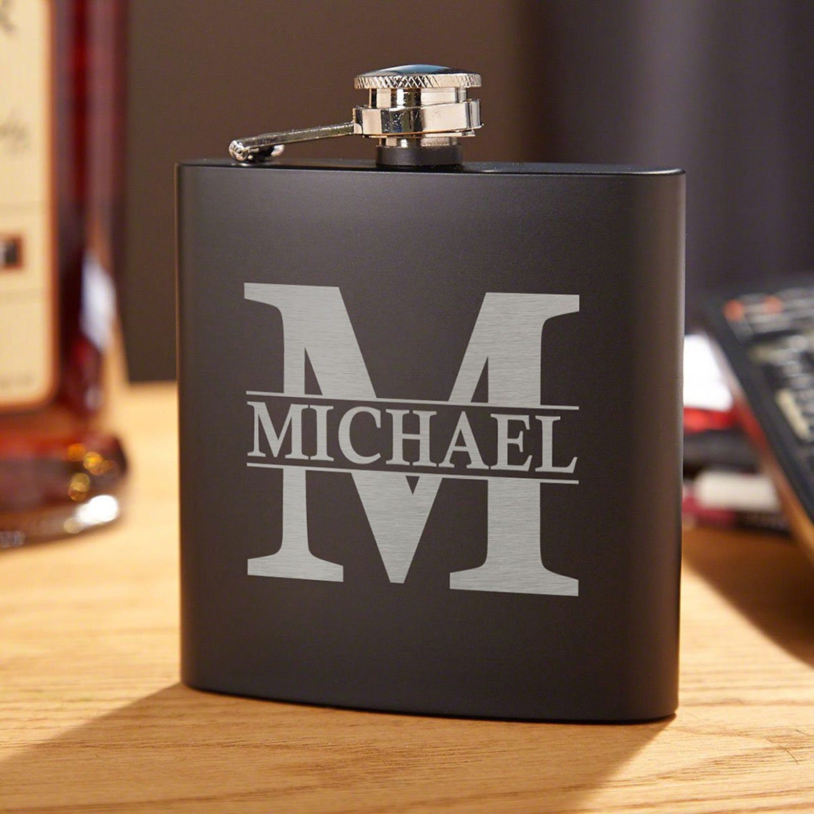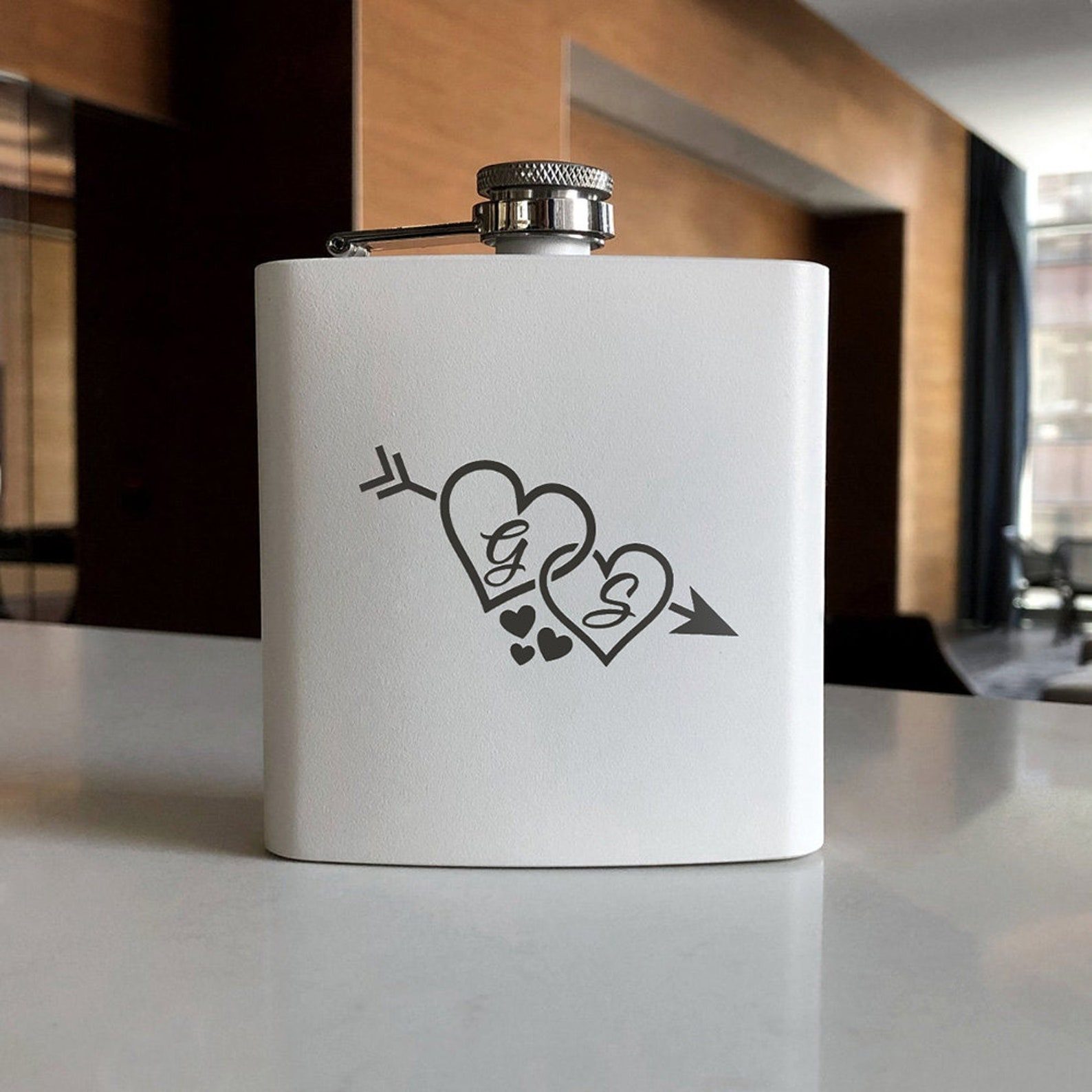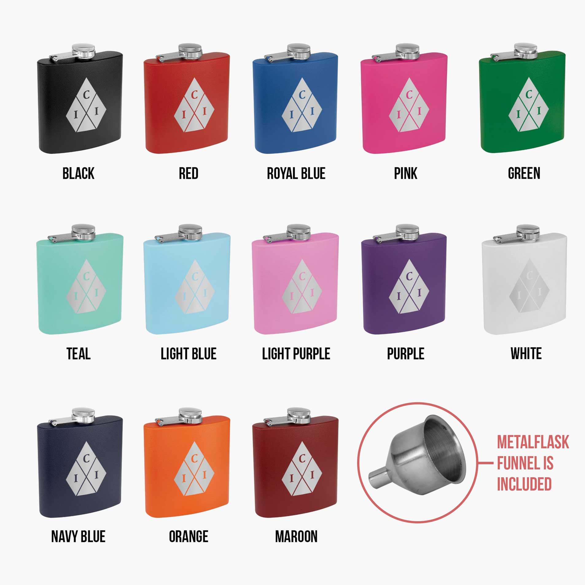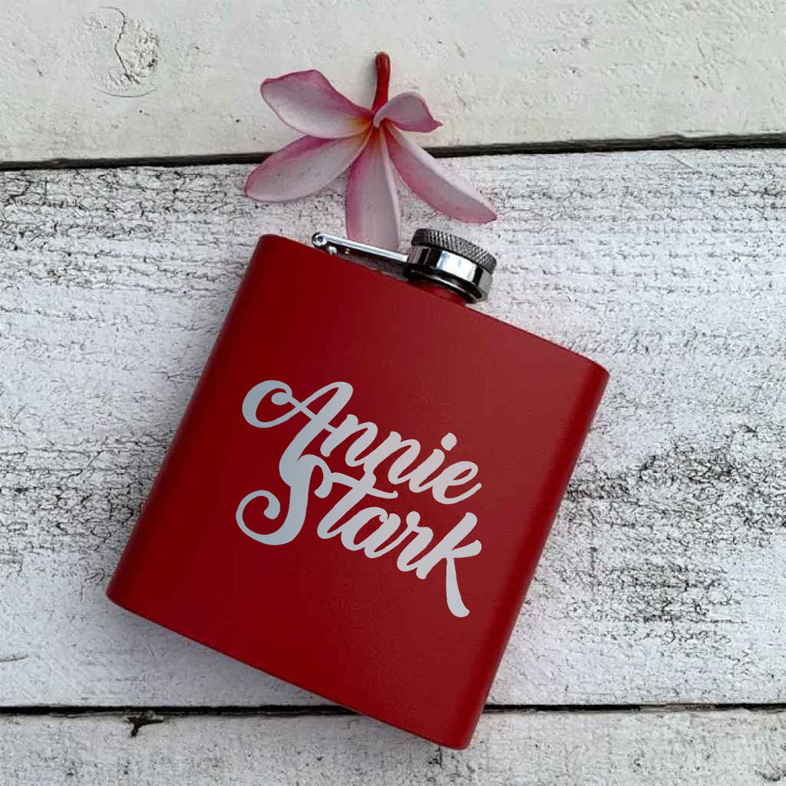 These custom engraved hip flasks are available in a variety of styles and colors, so you can create totally unique gifts. Place a monogram or other artwork onto the front of the hip flask. Large letters look the best on the colored background. Price includes engraving on one side.