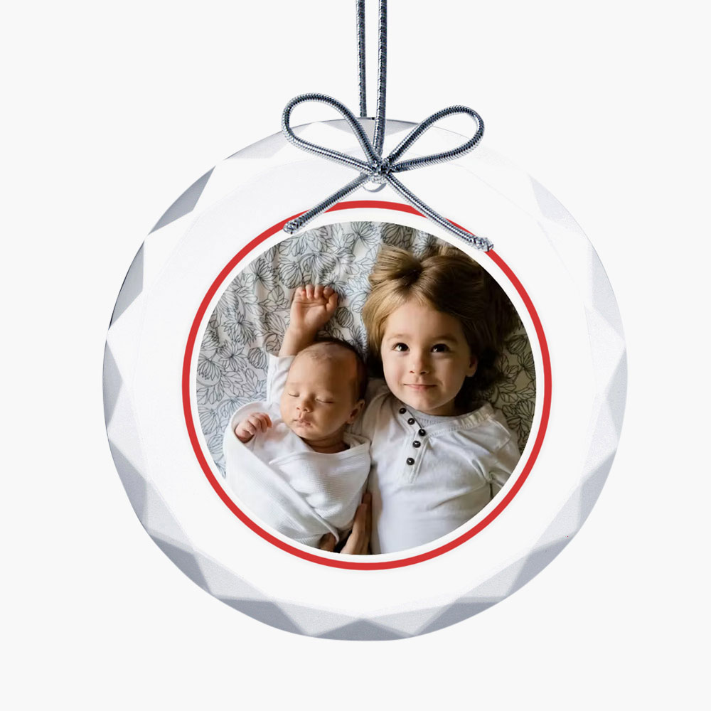 This multi-faceted crystal ornament has been gem-cut into the shape of a circle. The faceted edges refract light and captures attention, bringing focus to your personalized message.
