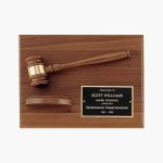 This 9″ x 12″ walnut wood gavel plaque has a walnut block extending from the board making it appear that the gavel is about to strike. This plaque can make a great present for judges, lawyers, principals, managers and decision making executives. The plaque also has a black brass engraving plate that can be personalized with a special message.